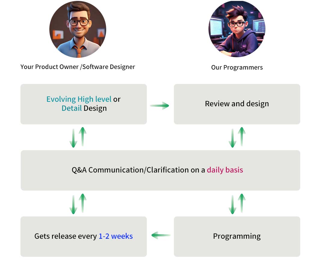 The agile development methodology illustrated in the Our Process diagram below will typically be used. However, the customer can choose their own process and tools for higher level of integration with their internal teams.